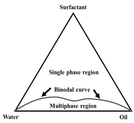 Surfactant solution injected into reservoir can be considered as a three elements system composed of brine, surfactant, and oil, each of these components rely on variable that interact with tensoactive structure and final behavior. Substances equilibrium properties can be represented in a ternary diagram, as shown in Figure 10. On a ternary diagram, a binodal curve describes a boundary between a single-phase (top region) and a multiphase section (bottom region). Micro-emulsion or micellar fluid are represented by single-phase section and two or more phases in equilibrium are represented by multiphase region. Miscible local displacement is favored for ternary diagram with a single-phase region as large as possible[28]. A multiphase region in a ternary diagram involves two external phases, oil and water, which are at opposite ends of lower vertices and an intermediate lamella structure phase, in which there may be a gel or a liquid crystal, these three types of micelles can coexist in equilibrium even when they constitute separate immiscible phases[35, 52-54].