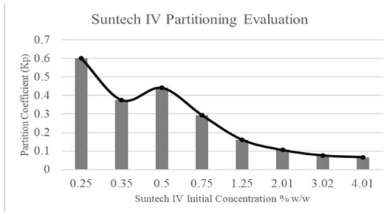 The Concentration is the main parameter to quantify phase partitioning between oil and water. Identifying concentration effect on surfactant solution will display how Kp behaves as anionic surfactant concentration increases. Figure 11 shows some results obtained by Al-Khafaji et al. They evaluated Kp behavior of alkyl aryl sulfonate Suntech IV while concentration increases in partitioning experiments after two days at 205°C. It can be observed that partition coefficient acquires high values at low concentrations, maximum Kp in the figure is on 0.25% w. However, Kp value decreases to small values as the surfactant concentrations increases. Tensoactive percentage that remains in aqueous phase and usable for subsequent parts of the process does not decrease less than 60%[28].