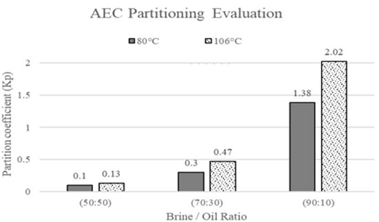 Furthermore, based on information by Belhaj et al. They also evaluated phase partitioning behavior of anionic tensoactive, after one day of exposure, known as alkyl ether carboxylate (AEC) with some initial surfactant concentrations at different brine/oil ratios, high temperatures and atmospheric pressure, one example is shown in Figure 12. Kp values for all scenarios were higher at 106°C as compared with 80°C after one day of exposure[62].
