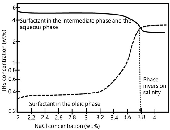 Chan & Shah identified that as salinity (NaCl concentration) increases, the surfactant molecules will partition preferentially in the oleic phase until reaching a phase inversion point. Kp value is one at the phase inversion salinity point[58]. Phase inversion on a petroleum sulfonate can be observed in Figure 13. At the initial surfactant concentration, the tensoactive tends to prefer aqueous phase. This tendency remains until reaching a 3% NaCl concentration. Then, surfactant amount that tends to prefer oleic phase begins to increase until reaching a point of phase inversion where surfactant will prefer oleic phase.