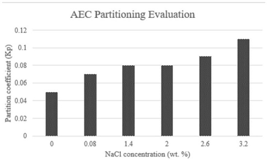 Another example is also found on Belhaj et al. studies. They tested the partitioning of alkyl ether carboxylate between 0% to 3.2% of NaCl concentration. Phase partition showed an increase because of salinity. Nonetheless, Kp value increasing was slower as compared with temperature effect. Some results obtained by the authors are displayed in Figure 14. Salinity in an anionic surfactant solution promotes changes in the phase behavior from lower phase (aqueous section), through middle phase toward upper phase (oleic section). Middle phase shows low interfacial tensions against oil and water. Thus, there is a partitioning into the interface and a reduction on IFT values due to the decrease in the repulsive forces caused by the presence of monovalent and divalent ions from the salt.[58, 62, 64]