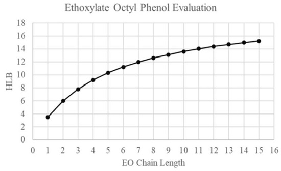 HLB value is considered an empirical way to determine surfactant molecule preference to aqueous phase or oleic phase. Equation 3 is a method to calculate HLB based on partition coefficient experimental data obtained However, there are more equations developed and related specifically to non-ionic surfactants[65]. Graciaa et al. calculated HLB values of non-ionic surfactant known as Ethoxylate Octyl Phenols at 25°C, as it is shown in Figure 15. Kp values indicated that the surfactant molecules have a greater affinity for the oil than for the water when surfactant chain length is less than C8 and HLB values are greater than 13[66].
