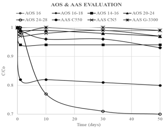 In Figure 16, some results of thermal degradation for some AAS without pH adjustment are also shown. These surfactants remain stable, even without KOH addition. Two AAS that remained with C / Co greater than 0.95, could be used up to temperatures of 300 ° C [18]. Sulfonate stability of Suntech IV were also tested by Al-Khafaji eat al. It was found that thermal degradation of AAS is not representative at 205°C[28].