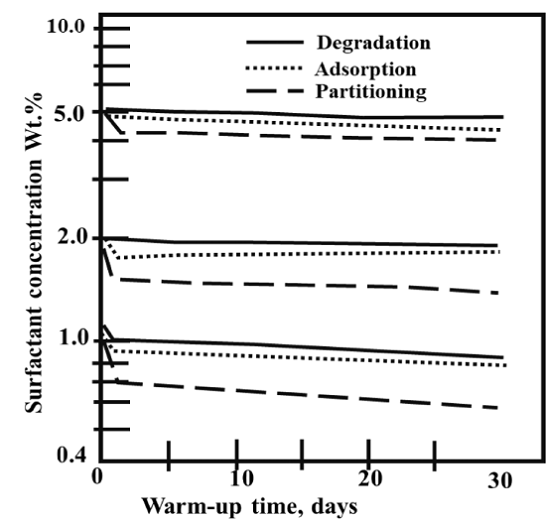 Thermal tensoactive loss, due to chemical kinetic reactions, is not representative as loss that is generated by phenomena such as adsorption and partitioning. It could be defined that sulfonates are considered in steam-foam injection processes because of their high stability and foaming generation ability. AAS have shown to be more resistant than AAS and petroleum sulfonates at alkaline conditions and temperatures up to 300°C[69]. However, AOS are stable to be used as a foaming agent in steam floods [18]. A way to reduce surfactant loss in reservoir by thermal degradation is by selecting and designing surfactant solution. Correct chain length and appropriate pH could improve foaming stability in porous medium.