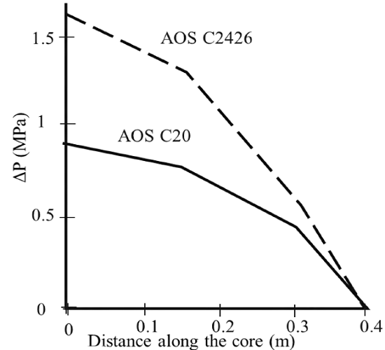 Lau & Borchardt, compared two AOS surfactant tests results, the first AOS with a chain length average of 24-26 carbons per molecule and the second AOS with a chain length average of 16-18 carbons per molecule. It was possible to define that there was an improvement in surfactant propagation rate, foam resistance and residual oil saturation reduction when carbons number in surfactant molecule was greater. Then, linear chain size (amount of carbons) influence directly tensoactive performance. Besides, it was determined that a longer chain produce a higher mobility reduction[17]. It is shown in Figure 4, where AOS tensoactives were also compared in terms of mobility reduction factor and molecular chain length.