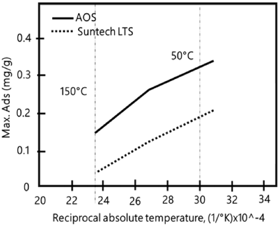 Novosad et al., conducted an experiment aimed at evaluating surfactant solution adsorption into a brine-saturated, unconsolidated sand core. Two specific surfactants were used in the experiment. Their selection was based on tensoactive stability at high temperatures. Enordet AOS 1,618 with 29.4% active alpha olefin sulfonate of 356 average molecular weight and Suntech IV with 35% active synthetic alkyl toluene sulfonate of 418 average molecular weight were surfactants used on the process. In Figure 8, it is shown that there is a decrease in alpha olefin sulfonate and alkyl aryl sulfonate maximum adsorption with a temperature increases from 50°C to 150°C.