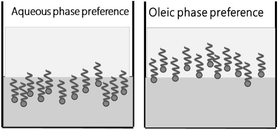 Chan & Shah identified that surfactant is preferentially soluble in oil phase if the sulfonates are of shorter chain length, and in brine phase if the longer chain length oils are used. They evaluated petroleum sulfonates anionic surfactants systems of various chain length from C6 to C16 known as TRS, with an initial concentration of 5% in 1.5% NaCl brine equilibrated. Surfactant molecules partitioned in oil phase and located in oil-external section at oil chain length less than C10. For oil chain length range between C11 to C14, surfactant located in middle-phase. Thus, water-external microemulsion was observed at chain length greater than C15. They could also define that partition coefficient value is unity at C12 oil chain length[58].