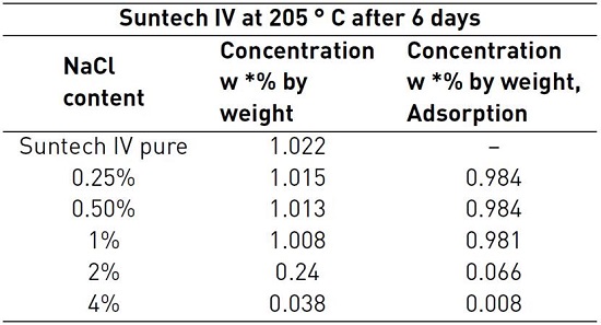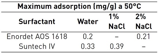 Besides, due to the fact related with previous AAS adsorption results at high salinity conditions, the issue should be studied further. Al-Khafaji et al, included on their adsorption displacement tests, Suntech IV adsorption change analysis due to temperature and salinity concentration effects. It is shown in Table 3. Results proved that salinities greater than 1% NaCl concentration will cause large AAS losses because of tensoactive precipitation as suspended gel. AAS surfactant concentration decreases from 1% to 0.24% at 2% NaCl. At 4%, concentration decreased further to 0.00039%. Precipitation can be attributed to material loss as result of abstraction-absorption phenomenon[28]. High salinities in brines at 205°C do not represent any beneficial effect. Then, it is important to know reservoir salinity for surfactant selection and to avoid any future complication. Besides, adsorption inhibitors could allow achieving good performances with a properly designed formulation[47].