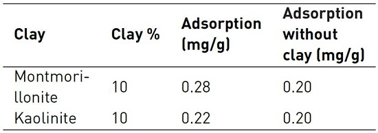Clay presence is a parameter considered on adsorption experiments developed by Amirianshoja et al. Quartz sand and clay mineral were mixed with anionic surfactant and then with non-ionic surfactant. After, they were separated by centrifugation to calculate adsorption values from the difference of the CMC before and after adsorption. Adsorption of the anionic surfactant was negligible and adsorption power of clay mineral are montmorillonite > kaolinite[48]. Other example is also developed by Novosad et al., studies. Some results of foaming-agent AOS displacement through cores with clay presence are displayed in Table 4. For montmorillonite adsorption corresponds to 0.08 mg/g which is approximately 40% of the initial loss. On the other hand, kaolinite clay only increased adsorption at 0.02 mg/g which refers to 10% of initial value[42].