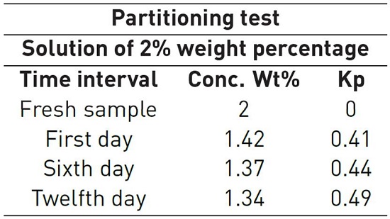 For temperature effect evaluation in phase partitioning, it is necessary to calculate Kp coefficient considering concentrations measurements before and after each experiment. Al-Khafaji et al. also developed partitioning evaluation. Partitioning experiment data was obtained evaluating alkyl toluene sulfonate surfactant known as Suntech IV over the days, at 205°C and 2MPa, it is shown in Table 5. The main goal was to identify surfactant loss tendency because of its retention in oleic phase[28]. It can be observed and abrupt surfactant loss at the beginning of the test, then Kp coefficient tends to a constant value. After 20 days of being exposed to about 205°C no more losses were registered by the authors.