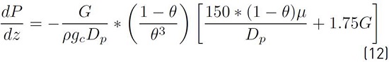 Since a reactive gaseous flow is present through a porous bed, the pressure drop along the length of the reactor is considered. Equation (12) represents this phenomenon: