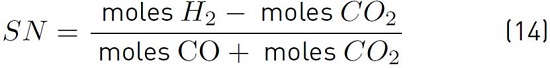 On the other hand, the stoichiometric number (SN) is also evaluated, which is determined by equation (14) and allows the relationship between the composition of H2, CO and CO2 to be seen, since these compounds are directly related to the synthesis of methanol.