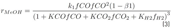 Although the Lurgi technology admits pressures ranging from 50 to 100 bar, in[17] the model was developed to operate between 15 and 51 bar, and concerning temperature, this model allows working in a range between 453 and 552 K[16]. However, it has been decided to work at the maximum pressure allowed by the model, since it favors the chemical equilibrium towards the formation of methanol. Also, a 523 temperature K is used, because it is a common condition for this type of system[14] and it has been reported that catalyst deactivation occurs at temperatures above 550 K[18]. The chemical kinetics to produce methanol from catalytic conversion of SYNGAS, are illustrated in equations (3), (4), and (5). Additionally, the equations (5) and (6) are used to define the parameters of kinetic expressions, the equations (7) and (8) denote the kinetic constants, and equations (9), (10), and (11) are the equilibrium constants involved in the methanol synthesis chemical reactions.