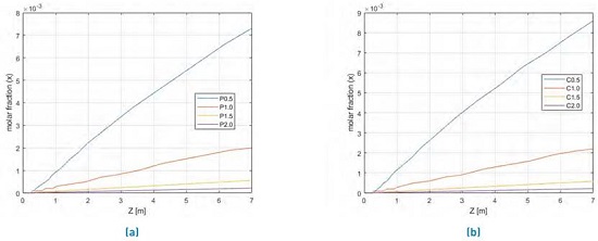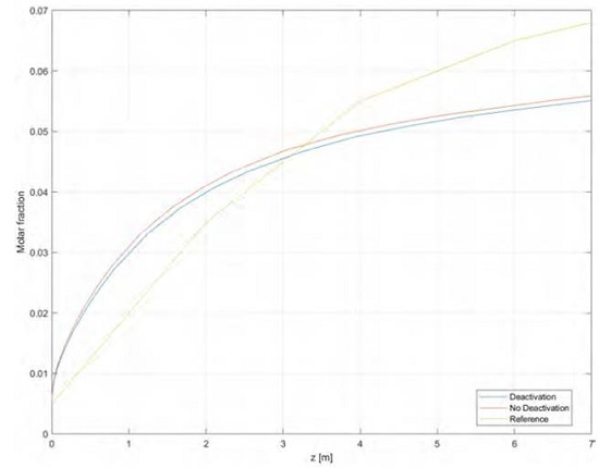 As the catalyst deactivation rate depends on the temperature and system operation time, what is expected is that the methanol molar fraction for catalyst deactivation model approaches these values, from a reactor longitude between 0 to 3 m, to the reference values, which are lower, because the catalyst activity loss increases with the time and a high temperature operation.