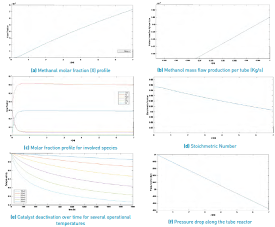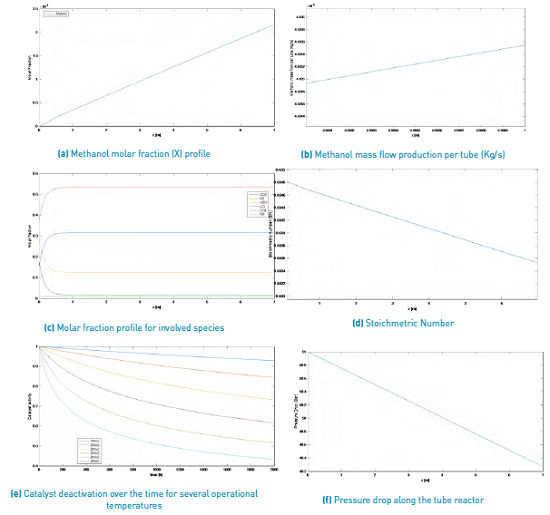 Initially, an algorithm is constructed in MATLAB©, to simulate the production of methanol, from SYNGAS, which uses the mathematical model illustrated in section 3 of this paper. The temperature variation along the reactor is not considered, since it is assumed that it operates isothermally, thanks to it is assumed the use of water as a refrigerant[18] and because it is expected to have a constant temperature, which favors the production of methanol and not drastically affecting the activity of the catalyst.