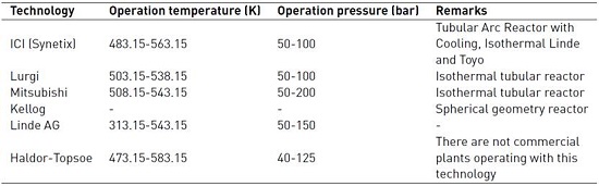 This heterogeneous process is highly exothermic[18,19]. Therefore, a cooling system must be implemented, since high temperatures affect life usefulness of the catalyst bed, due to the deactivation by thermal sintering[20]. The standard technologies used in methanol synthesis are shown in Table 1.