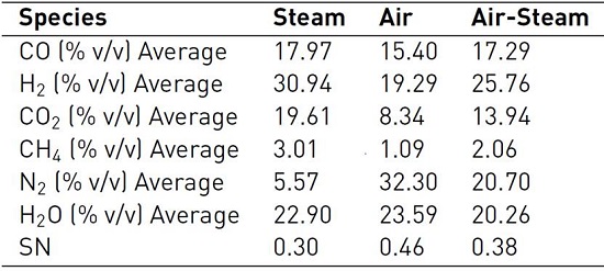 SYNGAS is a gaseous mixture obtained by gasification of carbonaceous material, such as biomass or coal. The process for SYNGAS production is called gasification, which consists in the conversion of these materials at moderate pressures and high temperatures, between 973.15 and 1473.15 K, in the presence of a gasifying or oxidizing agent, usually air, steam, or a mixture of them[26-29]. However, the quality, composition, calorific value, among other characteristics, depend on the physical and chemical properties of the biomass[30]. The characteristics of SYNGAS are shown in Table 2 and Table 3, for different types of agro-industrial biomass waste.
