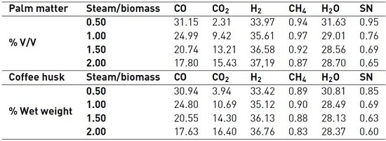According to the results in Figure 5, the best methanol production to both evaluated biomasses are for the 0,5 biomass/steam ratio. Therefore, the methanol production yield is increased, while the Steam-biomass relationship value decreased.