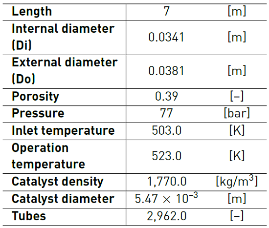 The processes conventionally used to produce methanol are carried out in fixed-bed multi-tubular reactors with a CuO-ZnO-Al2O3 catalyst in the form of pellets and operating in the gas phase[7, 15, 17]. The catalyst CuO-ZnO-Al2O3 is adopted, since it is the most used on an industrial scale, it allows working in a low pressure range, it has a high selectivity for methanol production, and it reaches an excellent level of CO2 conversion[1, 8, 18].