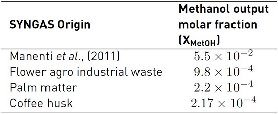 Table 6 shows the methanol results, using the selected biomass SYNGAS as a raw material. This information is useful to look for the best biomass for methanol synthesis.