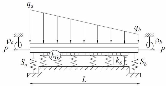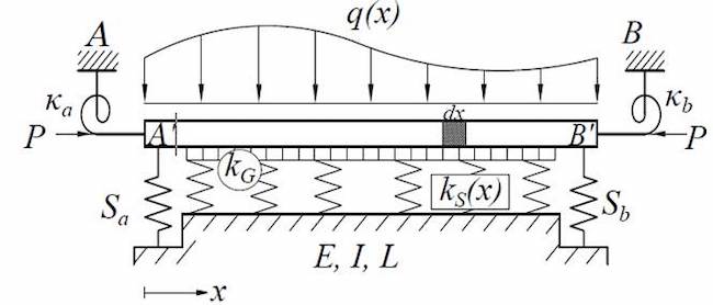 The behavior of beam-column elements resting on elastic foundations has been a subject of great interest in the last century [e.g.,[1-8]]. It has practical applications in civil engineering and other related engineering fields. Winkler[1], one of the pioneers in the field, proposed to represent the soil as a series of closely spaced linear springs. This idealization, currently known as the Winkler approach, though practical, is a simplification of the soil medium because it neglects the shear interaction between the elements. To overcome this limitation, several authors have proposed the use of a two-parameter model, where the first parameter is analogous to the Winkler’s spring and the second one represents a shear layer connecting the springs at the top ends[9-11]. Some models are derived to account for a uniform distribution of the modulus of subgrade reaction (i.e., homogeneous soil). In this case, the DE governing the response of the element can be readily solved using classical approaches. However, when the soil parameter varies along the element (i.e., non-homogeneous soil), the DE has non-constant coefficients, and its solution becomes difficult. Thus, in some cases it cannot be solved analytically and a numerical solution needs to be provided. The DTM is used to solve the governing differential equation, and its corresponding boundary conditions. The DTM is a simple, efficient, and powerful method that converts differential equations into recursive algebraic expressions [e.g.,[12-14]]. The DTM was first implemented by Zhou [15] to solve electrical circuit problems, and it is a practical and powerfully approach to solve linear and non linear differential equations. Some researchers have successfully employed the DTM to conduct static and dynamic analyses of beam-column elements [e.g.,[16-22]], but, in general, its application to civil engineering related problems is limited when compared to other fields. The following conditions are incorporated in the proposed analysis: (a) a Pasternak two-parameter elastic foundation to account for the interaction between the springs; (b) an external transverse load acting on the element that fits a quadratic function. (i.e., offers flexibility to consider uniformly distributed, trapezoidal or parabolic transverse loads); (c) any axial load, horizontal load and moment at each end of the element; and (d) semirigid connections and lateral restraints at the ends of the element. Both static and stability analyses can be conducted using the same set of equations, and the effects of any end-boundary condition on the element response can be studied without the need to discretize the solution for each individual boundary condition.