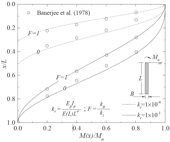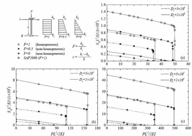 a non-homogeneous soil (linear distribution). Although any end-boundary condition maybe analyzed with the proposed formulation, for the sake of brevity, only piles free at the bottom and rotational inhibited at the top (ρa = 1) are investigated. This condition is encountered in practice in the analysis of pile-supported wharves and piers[27]. The lateral stiffness index is defined as