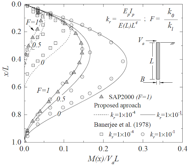 Figures 6 and 7 show, respectively, the normalized bending moment distribution of the pile when subjected to a horizontal load and a bending moment at the pile head. The results show that, regardless of the pile slenderness ratio, both the moment distribution and location of máximum moment are significantly affected by the variation of ks . Overall, bending moments are greater in short piles tan in flexible piles, and the magnitude decreases as ks moves from a linear triangular variation toward a uniform variation. The results are in good agreement with those reported by Banerjee and Davies[28] and computed with FE approaches (for the case of F = 1).