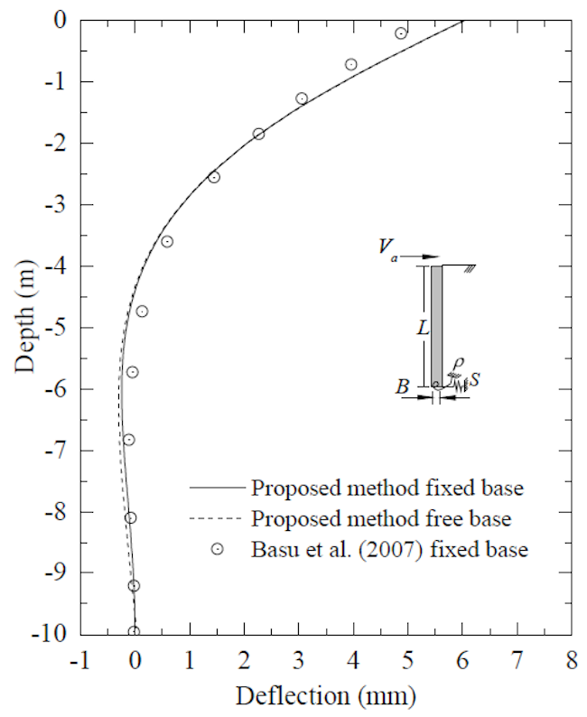 When subjected to external lateral loads, short piles experience a rigid body translation and rotation, and therefore their response is influenced by both end-boundary conditions. On the other hand, long piles are those whose response is not influenced by the boundary condition at the base[29]. In general, a long pile is considered a pile with a slenderness ratio (L/r > 80). Piles with L/r < 80 exhibit a transition from a flexible behavior toward a rigid one[30]. Pile slenderness ratio (L/r) and relative stiffness ratio (Ep/ks ) have a strong influence on the pile response. Here, some examples are reproduced from Basu and Salgado[31] to show this particular behavior. Figure 8 shows the deflection profile of a concrete short pile with radius r = 0.5 m, Length L = 10 m, and modulus of elasticity Ep = 2.4 × 106 kPa, fully embedded in a clay deposit with ks = 11.6 MPa and kG = 6.8 MN, and subjected to horizontal load of 100 kN at the head. The pile is considered to be free at the head (ρa = 0 and Sa = 0) and either free (ρb = 0 and Sb = 0) or fixed (ρa = 1 and Sb = ∞) at the bottom. The results obtained from the proposed method and the method of initial parameters (MIP) developed by Basu and Salgado[31] show good agreement. Figure 9 shows the transverse deflection of a concrete pile with radius r = 0.25 m and lengths of L = 2.5 m, L = 5 m, and L = 6 m, embedded in a dense sand deposit with ks = 130 MPa and kG = 7.9 MN, and subjected to a horizontal load of 100 kN at the head. The pile is considered to be free at the head and either free or fixed at the bottom. The 2.5m long pile shows that the base condition influences the deflection response. Meanwhile, the 5 m and 6 m long pile have the same response for both free and fixed conditions.