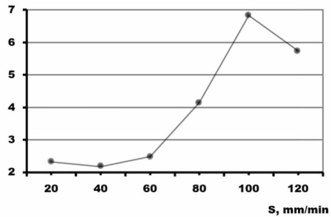 Based on preliminary studies[11], it is found that it is advisable to use a vibroacoustic signal in the frequency range from 6 to 12 kHz to evaluate non-roundness parameters. Processing is performed at different values of cutting speed and feed. It is when the tool wear chamfer on the back surface is from 0 to 2.4 mm. Example of the experiments’ series: the material of the parts is 45, and 40Cr steel, the material of the cutting tool is VOK 60. Heat treatment, hardness up to 54 HRC. The diameter of the workpieces is 50 mm; the cutting depth is t=0.2 mm. The number of turns is 630 rpm. S = 20; 40; 60; 80; 100; 120 m /min.