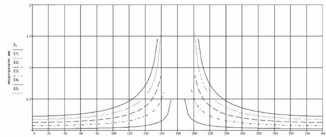 Figure 3 shows the dependence of the value of the eccentricity on the value of the angle corresponding to the arc of contact between the tool and the workpiece. Dependencies are presented for five different values of the tuning size.