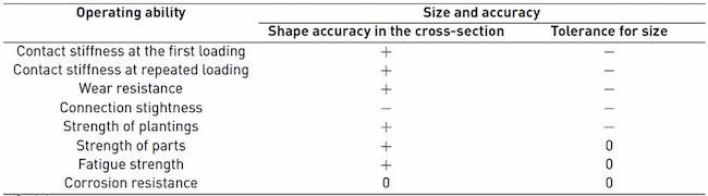 The shape error in the cross-section (ovality, cut) leads to the fact that the contact of the surfaces is developed at separate points, significantly reducing such operational properties as tightness, durability, and some others. The influence of shape accuracy parameters on performance properties is shown in Table 1.
