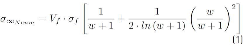Modeling fragmentation is fundamental for the determination of the mechanical stress-strain response of composite materials[37-39]. One of the earlier models was developed in[40], where a stress-strain analytical law was obtained from a Taylor series expansion of the Weibull function of strength. This model was later extended in[41, 42] to explain the superposition of the influence zones nearby the fiber breaks. On the other hand, in[43], a governing equation was obtained for a problem of fiber fragmentation; however, this cannot be solved analytically. More recently, in[44], a progressive damage model for unidirectional composite laminates based on the fragmentation phenomenon was developed, capable of accounting for the loss of stiffness on the neighborhood of the break. The main difference between these works lies in considering or not phenomena such as fiber pull-out, fiber sliding and separation, and/or the distribution of load after breaking. The model developed by Neumeister[41, 42] is widely used and includes a refined constitutive law with a suitable approximation to predict the tensile behavior of brittle materials. The Neumeister equation is given by (1):