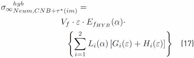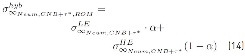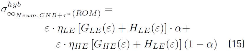 The theoretical models for hybrid composites based on the Neumeister equation generate continuous curves that intend to reproduce the behavior of the schematic stress-strain diagrams of Figures 4a and 4b. According to[45], under the premise of uniform strain, the tensile stress of the hybrid composite can be considered as the volume-weighted average of tensile stress of the LE and HE sub-composites. If the CNB+τ* Equation (8) is used to estimate the tensile stress of the hybrid composite using the typical bilinear rule of mixture (ROM), the Equation (14) is obtained: