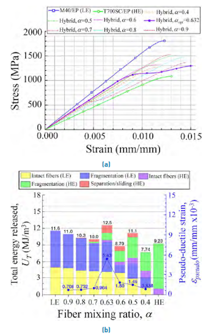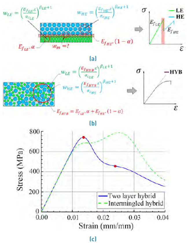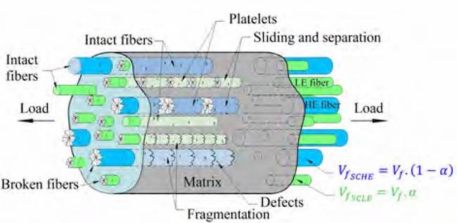 A composite is a material produced from two or more constituent materials. They can be more damage-resistant and pseudo-ductile if different reinforcements are combined to obtain hybrid configurations. The purpose of integrating two types of fibers into a single composite is to maintain the advantages of both fibers and mitigate some drawbacks. The reinforcements of the hybrid composite are typically classified as low elongation (LE) and high elongation (HE) fibers. Generally, in layer-by-layer hybrids, the failure takes place first in the LE fibers. The hybrid effect has been evidenced in the seventies by[1] in a study about hybrid composites with unidirectional carbon and glass layers, where an increase of the ultimate strain of carbon fibers hybridized with glass was obtained with respect to non-hybrid carbon laminates. In a similar fashion,[2] also reported an increase of the ultimate strain in unidirectional hybrid carbon/glass laminates compared to only carbon ones. The pseudo-ductile behavior of hybrid composites has been noticed by[3] in glass/carbon/glass sandwich laminates. In[4], a previously developed model for unidirectional composites was extended to analyze the hybrid effect in terms of three parameters: low elongation fiber strength scatter, hybridization fiber stiffness, and failure strain. The increase of the former parameter brings about the continuous growth of the hybrid effect, whereas the increase of the ratio between failure strain of high-elongation (HE) and low-elongation (LE) composite causes the increment of this effect until a determined point, from which this change is practically negligible. Increasing the stiffness of the hybridization fiber also contributes to enlarging the hybrid effect.