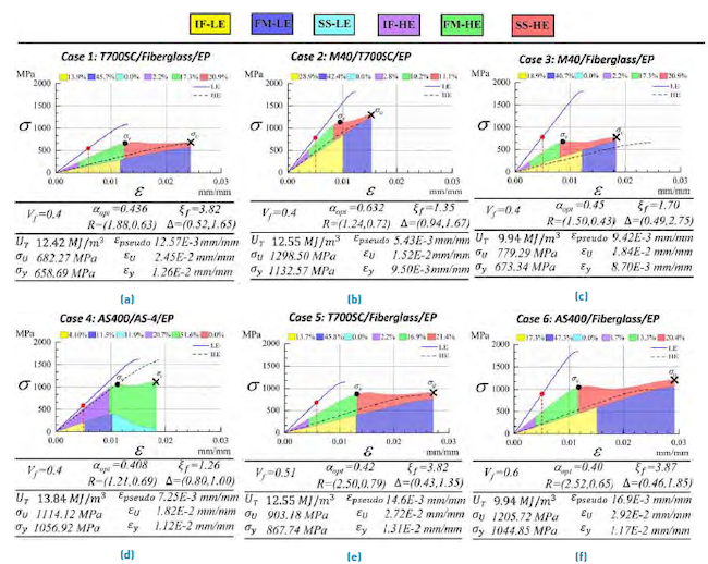 It is important to highlight that the present CNB+τ* model predicts that the initial failure strain of LE fibers, as defined by the strain corresponding to the transition between the IF and FM zone, increases due to the hybridization. This is in agreement with preceding works[1, 2, 66, 67] and can be attributed to the same three mechanisms mentioned in section 4.2[66]. In Figure 11a-f, the initial failure strain of the non-hybrid LE composite corresponds to the red, circular point in each continuous blue line, whereas the initial failure strain of the LE sub-composite in the hybrid is the boundary between the yellow and blue zones. As can be observed, for the carbon/carbon hybrid composite AS400/AS-4/EP (combination 4), the initial strain of LE fibers slightly rises with hybridization; for the remaining cases, this strain notoriously increases with hybridization.