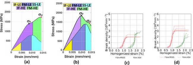 On the other hand, the composite AS400/AS4/EP [Figure 11d) has distinctive characteristics to the other ones, namely, both tensile strength and Weibull modulus, (, of both reinforcements are very similar. Since ( is practically the same ((=10.3 for AS400 and (=10.7 for AS4), it is expected a similar fiber strength dispersion and failure strain distribution for both reinforcements, and thereby, an interaction between LE and HE fibers governed by the difference of the failure strain of these reinforcements, as commonly obtained in layer-by-layer composites. Accordingly, as the failure strain of the composite AS400/EP (LE) is smaller than that of composite AS4/EP (HE), it is expected that fragmentation takes place first in LE sub-composite and then, near the crack saturation of this sub-composite, fibers begin to break in the HE sub-composite, and sliding-separation (SS) phenomena is developed in the LE, delaying the formation of the cluster of broken fibers in the HE. This behavior has also been previously reported in[27] for the intermingled hybrid M50S/AS4/EP analyzed in Section 4.1, and it is predicted as well by the present CNB+τ* model for such composite system. To illustrate this, let us consider the energetic decompositions of CNB+τ* curves of Figure 6e (positive synergy) and 6g (negative synergy), which are represented in Figures 12a and 12b, respectively. For the positive synergy case [Figure 12a), the failure sequence is: LE fibers start breaking first, then LE crack saturation occurs, and thereupon, HE fragmentation starts, to then continues developing while the broken LE fibers serve as ‘platelets´, until composite failure takes place. For the negative synergy case [Figure 12b), the failure sequence is similar, with the difference that the initial HE fragmentation occurs before the LE crack saturation. In Figures 12c and 12d, it is shown the evolution of the break density with the strain obtained in[27] for the two cases analyzed, where similar failure stages to the ones obtained with the present CNB+τ* model can be appreciated, although at different strain levels.
