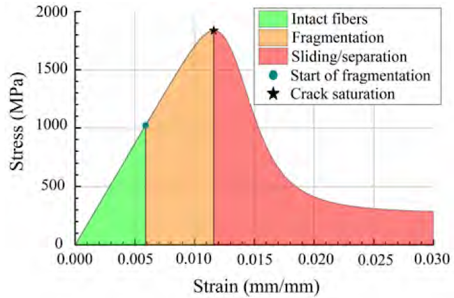 The curve obtained from (8) can be divided into several zones accounting for the phenomena involved during the damage process, as shown in Figure 2 for a CFRP composite. These zones are: zone of intact fibers (green zone) where fiber fragmentation is not occurring and a linear elastic behavior is reached, zone of fragmentation (orange zone) where successive fiber breaking takes place until the crack saturation arises, and zone of sliding/separation (red zone) where fiber breaking stops and the loading support capacity is reduced. In the elastic zone, the function of intact fibers,