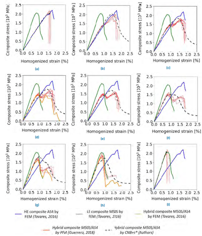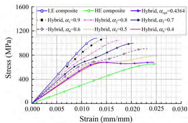 Some studies have investigated the importance of the constituents’ proportions on the hybrid behavior, concluding that there is an upper threshold for the volume ratio of LE to HE fibers, above which the complete fracture can be considered brittle[29-31]. Other approaches have focused on the local fiber arrangement, where the proportion, as well as the thickness of the constituents, plays an important role in obtaining a pseudo-ductile response[9, 11, 12, 32-34].