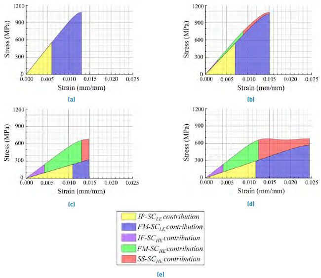 defined in (28). Additionally, the energetic contributions classified according to the phenomena IF, FM and SS are quantified and identified by colors. The total energy released per unit volume (UT ) and pseudo-ductile strain (εpseudo ) are also included, as well as the ultimate tensile strength (σu ) and strain (εu ). Finally, the yield strength (σy ) and strain (εy ) are shown too.