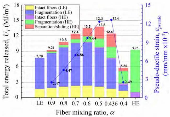 , the energetic contribution by IF, FM and SS phenomena of HE reinforcement is negligible, and the brittle behavior of the hybrid composite is practically dominated by the LE sub-composite. On the other hand, for