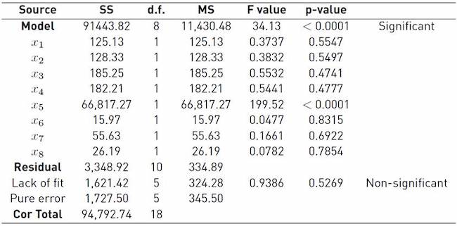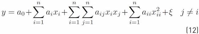 In expressions (11) and (12), coefficient a0 is the origin ordinate, coefficient ai is the first-order effect of variable i; coefficient aij is the effect arising from the interaction between factors i and j; coefficient aii is the quadratic effect of factor i, and term ξ is the noise or effect resulting from factors that are not considered in the model.