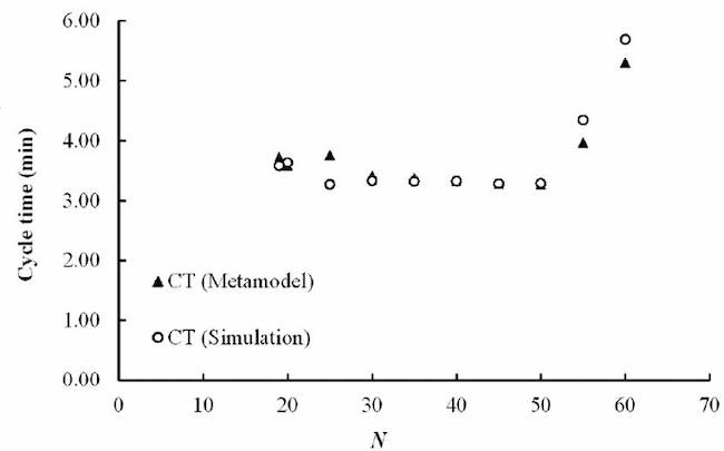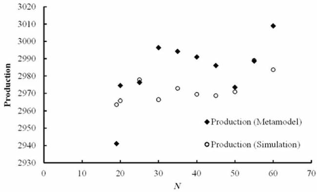 Several approaches can be found for obtaining the metamodels of performance indicators: neural networks applied to asynchronous lines in series and with failures[18]; 2K experimental design combined with simulation[19]; fractional factorial designs[20] to obtain the production rate of a line with assembly and failures; response surface methods to obtain a model for production in an unreliable system[21]. A general conclusion is that models with interactions between buffers predict Th, TC, or WIP more accurately than linear models.