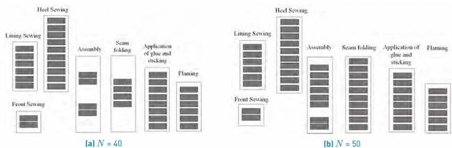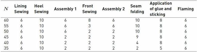 The line in question consists of 7 operations and produces a specific model of shoe. In the first operation, the parts that form the shoe lining are joined together by seams (Lining Sewing). On leaving this process, the parts that form the heel of the shoe (Heel Sewing) are joined together. In parallel, the front part of the shoe is joined to the heel by a seam (Front Sewing). In the stage known as assembly, the pieces are put together to give shape to the shoe. During the next phase, the seam created during assembly is folded (Seam folding), then glue is applied to the lining, which is turned over to be glued to the leather (application of glue and sticking), and it is finished by burning off surplus threads (Flaming). The pairs are put together and then sent to another section of the factory [Figure 1]. We must take into account that the stations have different operating times (unpaced).
