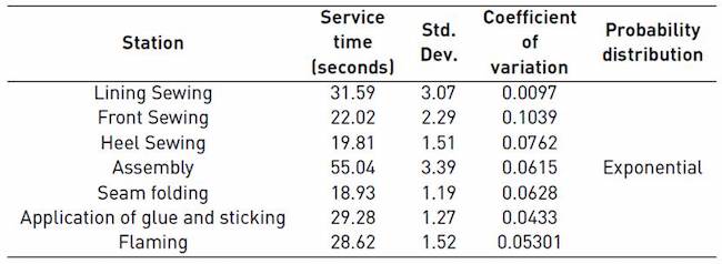 The average service time at each station was obtained from a sample[1]. The total data in each one was 20. Then the mean, standard deviation, and coefficient of variation were obtained [Table 1]. From the coefficient of variation, the operations were observed to have a low natural variability; the sample does not consider failures at the stations that interrupt the output of shoes and make a piece stay longer in the system: the absence of workers or failures of the sewing machines are the failures that are more often observed on this line; however, there are no data at the moment; in view of the above, we shall, as an approximation to a real process operation, assume a moderate variability with a coefficient of variation equal to 1 value that corresponds to an exponential probability distribution[26].