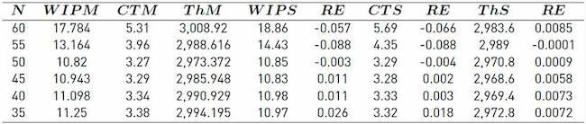 A working day consisting of two 8-hour shifts each or 960 minutes is simulated, rejecting the first hour of simulation, which corresponds to the heating period. The recorded performance measurements were Cycle Time and Th; the WIP on the line was obtained by applying Little’s Law: WIPS = Th X CTS.