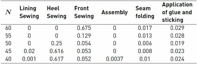 We observe that the x5 (Lining sewing Buffer ) and x1 (Heel Sewing Buffer) variables are significant, followed by the x3x7 (Glue and sticking Buffer - Assembly Buffer 1)interaction; finally, there are the marginal effects of the following interactions: x1x7(Heel Sewing Buffer - Assembly Buffer 1), x3x6(Glue and sticking Buffer- Front sewing Buffer), x1x3(Heel Sewing Buffer- Glue and sticking Buffer), x4x7(Flaming Buffer- Assembly Buffer 1), x5x8 (Lining sewing Buffer - Assembly Buffer 2)and x2x8 (Seam folding -Assembly Buffer 2)[Table 7].