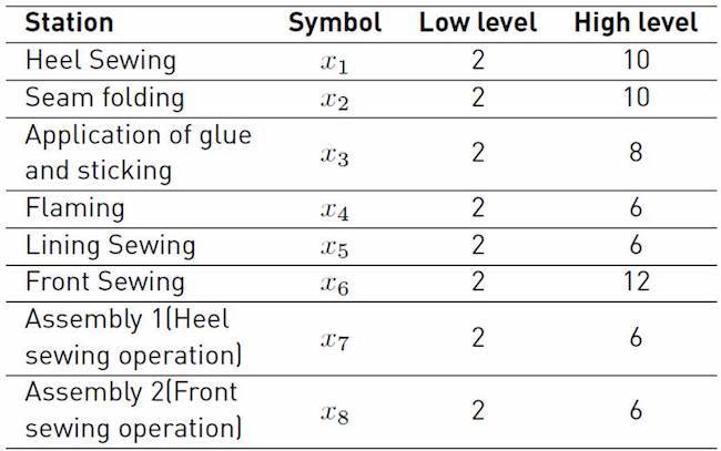 ABSTRACT: Footwear production is subject to the variability inherent in any process, and producers often need to apply tools that allow them to make the right decisions. This work documents the process to optimize the buffer allocation in a shoe manufacturing line minimizing the cycle time in the system, applying a metamodeling approach. It was found that the Front sewing operation, and the interaction between the Lining sewing operation and the assembly operation have the greatest effect on the flow time of the product within the process; the optimum assignment of spaces follows a non-uniform arrangement on the line saturating the slower stations; the cycle time follows a non-linear behavior vs. the total number of spaces (N) in the line. For a certain value of N, the cycle time reaches a minimum value.