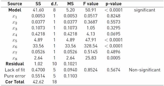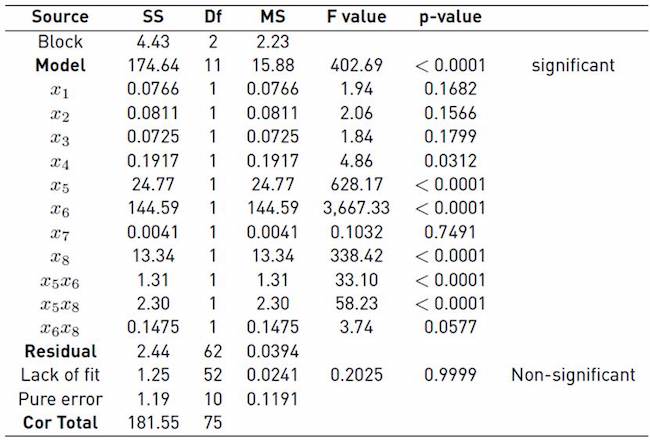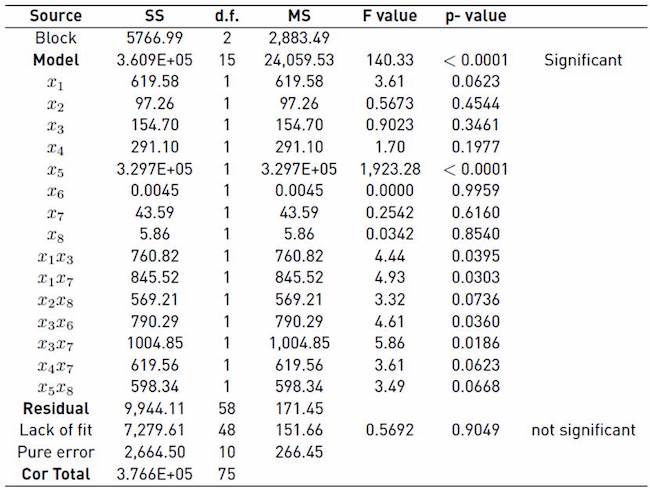 The original experimental design was increased with new runs to determine the coefficients corresponding to the interactions. Twenty-four points/combinations were added with two replications each to estimate the standard error, which gives 48 experiments. The curvature is not significant but, for the purpose of improving the precision, 6 additional runs were added with 3 central points, which generates a second block with 57 experiments. Adding the two blocks together, the design has 76 experiments. With the stepwise method, the non - significant interactions were rejected by employing the statistic p as a criterion, and thus a reduced model was obtained.