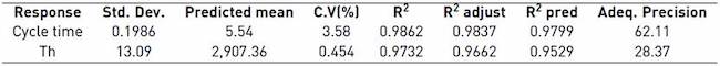 The ANOVA table for the cycle time [Table 3] shows that the linear model is significant for the cycle time; in other words, it contains the factors that explain the behavior of the cycle time.