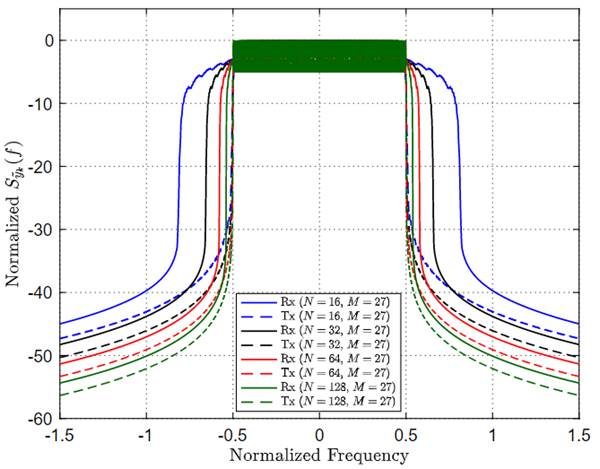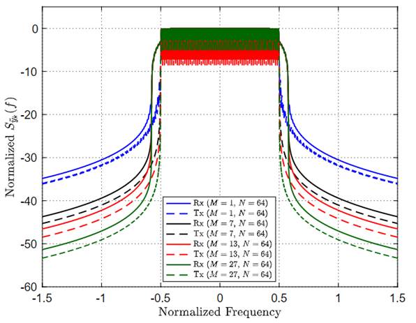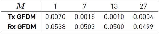 Figure 2 presents the PSD of GFDM symbols for different numbers of sub-symbols. These PSDs were obtained assuming a raised cosine shaping pulse, a rectangular windowing pulse, and using [3] and [4]. This figure shows that the spectral behavior of the transmitted GFDM symbol is improved when high values of M are chosen. Note that when M = 1, the waveform is the classic OFDM.